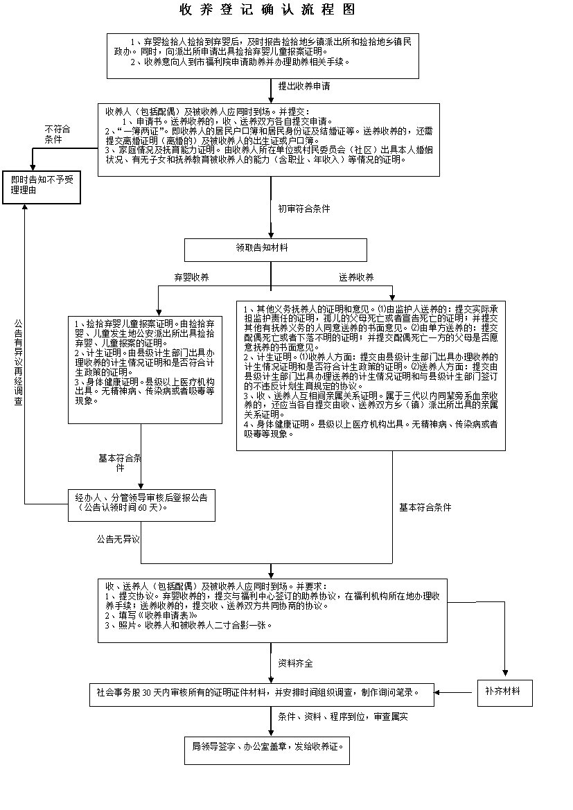 提交材料:(1)收养人提交:①收养人夫妻双方签名的申请书;②夫妻双方的居民身份证、户口薄、结婚证(复印件)③所在单位或村(居)委会出具的本人婚姻状况,有无子女及有无供养教育被收养人的能力等情况证明,④县以上医院出具的夫妻双方身体健康检查证明,⑤计划生育部门出具的生育情况证明、⑥社会福利机构证明⑦当地公安机关出具的捡拾弃婴、儿童的报案证明、⑧夫妻双方二寸单人彩照各二张。两寸三人合影照片两张⑨地区以上报纸刊登的弃婴公告。