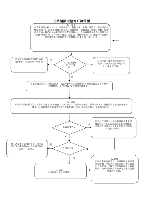 2、审查阶段责任:申请材料书面审查;根据需要对车货总重超过55吨或需要监护通行的车辆进行现场审查(现场勘验);根据需要征求部门意见(征求公安机关交通管理部门、公路经营企业意见);对车货载重超过200吨(不含200)或轴载质量超过公路桥梁承载能力的车辆,需要提供桥梁检测报告:对货车总重超过300吨(含300)的车辆,需要组织专家评审;提出初审意见决定阶段责任:作出决定(不予行政许可的应当告知理由);其他法定告知。 5、其他法律法规规章文件规定应履行的责任。 |