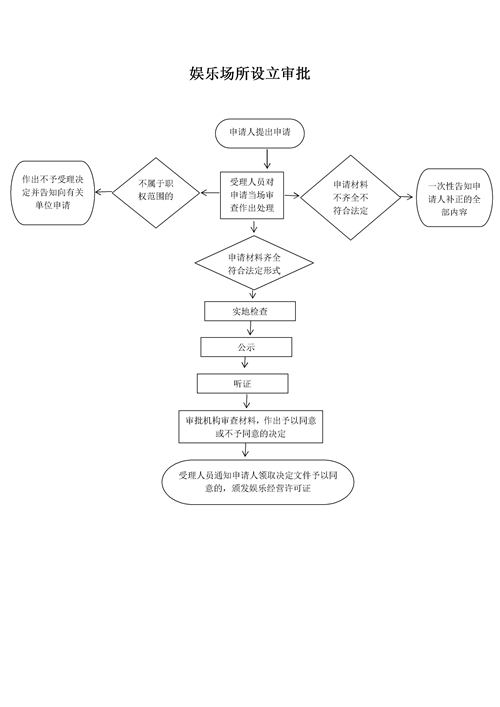 《娱乐场所管理条例》(国务院令第458号发布,第666号修订)第九条第一款 设立娱乐场所,应当向所在地县级人民政府文化主管部门提出申请;设立中外合资经营、中外合作经营的娱乐场所,应当向所在地省、自治区、直辖市人民政府文化主管部门提出申请。第三款 受理申请的文化主管部门应当就书面声明向公安部门或者其他有关单位核查,公安部门或者其他有关单位应当予以配合;经核查属实的,文化主管部门应当依据本条例第七条、第八条的规定进行实地检查,作出决定。予以批准的,颁发娱乐经营许可证,并根据国务院文化主管部门的规定核定娱乐场所容纳的消费者数量;不予批准的,应当书面通知申请人并说明理由。第十二条 娱乐场所改建、扩建营业场所或者变更场地、主要设施设备、投资人员,或者变更娱乐经营许可证载明的事项的,应当向原发证机关申请重新核发娱乐经营许可证,并向公安部门备案;需要办理变更登记的,应当依法向工商行政管理部门办理变更登记。第七条 娱乐场所不得设在下列地点:(一)居民楼、博物馆、图书馆和被核定为文物保护单位的建筑物内;(二)居民住宅区和学校、医院、机关周围;(三)车站、机场等人群密集的场所;(四)建筑物地下一层以下;(五)与危险化学品仓库毗连的区域。娱乐场所的边界噪声,应当符合国家规定的环境噪声标准。第八条 娱乐场所的使用面积,不得低于国务院文化主管部门规定的最低标准;设立含有电子游戏机的游艺娱乐场所,应当符合国务院文化主管部门关于总量和布局的要求。 |
