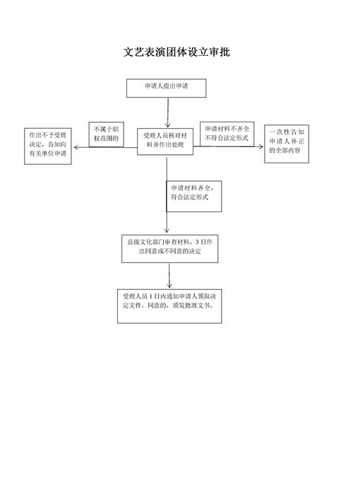 《营业性演出管理条例》(国务院令第439号发布,第528号、第638号、第666号修订)第六条 文艺表演团体申请从事营业性演出活动,应当有与其业务相适应的专职演员和器材设备,并向县级人民政府文化主管部门提出申请;演出经纪机构申请从事营业性演出经营活动,应当有3名以上专职演出经纪人员和与其业务相适应的资金,并向省、自治区、直辖市人民政府文化主管部门提出申请。文化主管部门应当自受理申请之日起20日内作出决定。批准的,颁发营业性演出许可证;不批准的,应当书面通知申请人并说明理由。第七条 设立演出场所经营单位,应当依法到工商行政管理部门办理注册登记,领取营业执照,并依照有关消防、卫生管理等法律、行政法规的规定办理审批手续。演出场所经营单位应当自领取营业执照之日起20日内向所在地县级人民政府文化主管部门备案。第八条 文艺表演团体变更名称、住所、法定代表人或者主要负责人、营业性演出经营项目,应当向原发证机关申请换发营业性演出许可证,并依法到工商行政管理部门办理变更登记。演出场所经营单位变更名称、住所、法定代表人或者主要负责人,应当依法到工商行政管理部门办理变更登记,并向原备案机关重新备案。 |