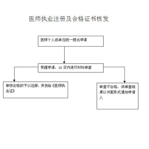 提交材料:(一)医师执业注册申请审核表; (二)二寸免冠正面半身照片两张; (三)《医师资格证书》; (四)注册主管部门指定的医疗机构出具的申请人6个月内的健康体验表; (五)申请人身份证明; (六)医疗、预防、保健机构的拟聘用证明; (七)省级以上卫生行政部门规定的其他材料。 获得执业医师资格或执业助理医师资格后二年内未注册者,申请注册时,还应提交在省级以上卫生行政部门指定的机构接受3至6个月的培训,并经考核合格的证明。