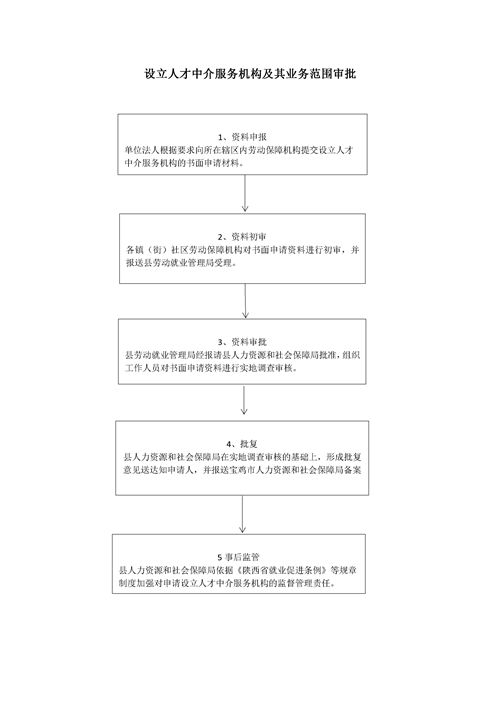 第十八条 设立人才市场中介机构,须向有审批权的人事行政部门提出书面申请。人事行政部门自收到申请之日起三十日内作出是否批准的决定,经审查符合规定条件的,发给《陕西省人才市场中介服务许可证》。取得许可证的,应当到工商行政管理部门和税务部门办理登记。《陕西省就业促进条例》第二十七条 设立人力资源中介服务机构,应当经县级以上人力资源和社会保障行政部门批准,取得人力资源中介服务许可证,并办理工商、税务登记。第二十九条 人力资源中介服务机构应当诚信服务,守法经营,在服务场所醒目位置放置许可证、营业执照等证件,标明服务项目、收费标准,公示从业人员姓名、照片等信息,公布投诉举报电话,并建立服务台账,记录服务对象、服务过程、服务结果和收费情况。