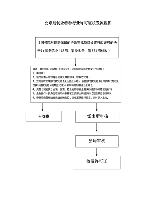 《国务院对确需保留的行政审批项目设定行政许可的决定》(国务院令412号、第548号、第671号修改)第37条:公章刻制业特种行业许可证核发 ,县级以上地方人民政府公安机关实施。 |