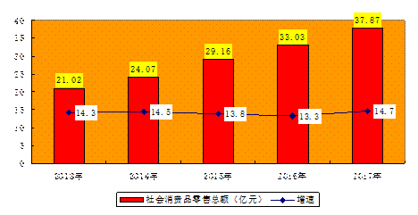 全年社会消费品零售总额37.87亿元,比上年增长14.7%。按消费区域分,城镇消费品零售额32.11亿元,增长15.2%,占全社会消费品零售总额的84.8%;农村市场实现消费品零售额5.76亿元,增长11.5%,占全社会消费品零售总额的15.2%。按消费形态分,餐饮收入5.29亿元,增长18.2%;商品零售32.58亿元,增长14.1%。
