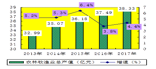 图3:2013-2017年全县农林牧渔业总产值及增速
