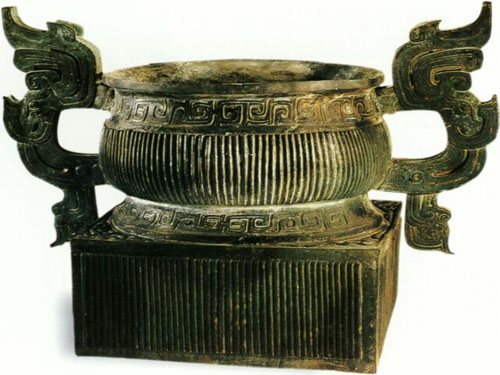 器盖上有四道范缝痕迹,器身至方座上有四道贯通的范缝痕迹,可见此两部分在铸造时均使用了四块外范。两耳部各有一穿孔,似为分铸耳部时所设之浇口。