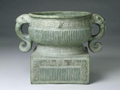 方座四面饰兽面纹,兽面以方座四角为鼻,云雷纹衬地。方座内顶部有挂铃的索状半环钮 ,铃已失。