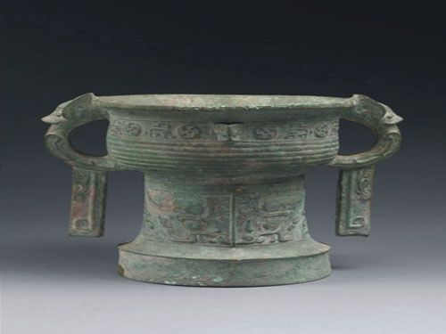 口沿和圈足饰以云雷纹衬地的兽目交连纹。腹部两侧有兽首形耳,兽首双角呈螺旋状,略高出器口,屈舌上饰重环纹,下有象鼻状垂耳。腹部饰覆瓦纹。
