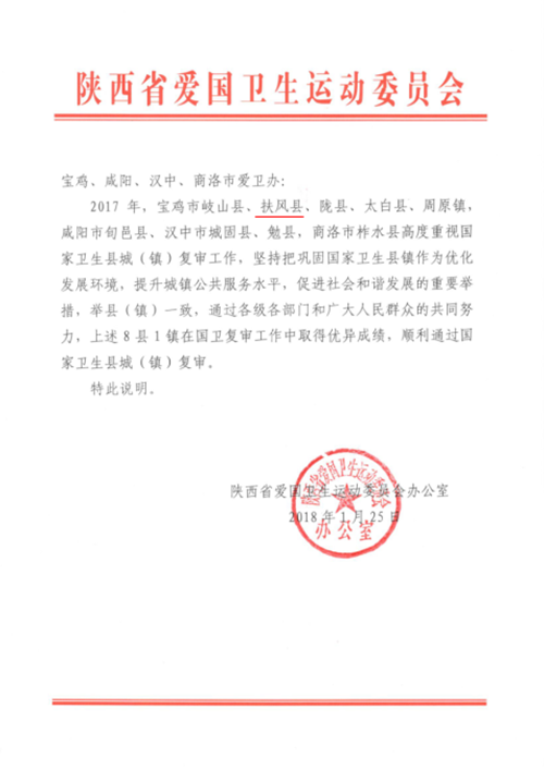 日前,从陕西省爱卫会传来喜讯,扶风县顺利通过国家卫生县城第二次复审。